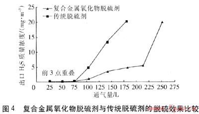 將改進(jìn)后的脫硫劑與傳統(tǒng)工藝生產(chǎn)的脫硫劑在同樣的實(shí)驗(yàn)條件下,進(jìn)行了比較,結(jié)果見圖4。實(shí)驗(yàn)條件為:反應(yīng)器直徑為8mm,長度為33cm,脫硫劑粒度為420~840μm目,裝填質(zhì)量為5g,流速為1.0L/min,空間速度為9000h一左右;試驗(yàn)氣體為硫化氫和氮?dú)獾幕旌蠚怏w;進(jìn)口硫化氫質(zhì)量濃度為1.0g/m3,硫容穿透標(biāo)準(zhǔn)為出口硫化氫質(zhì)量濃度>20mg/m3。從圖4可以看出,在上述實(shí)驗(yàn)條件下,傳統(tǒng)工藝生產(chǎn)的脫硫劑通氣量為180L就穿透;而改進(jìn)后的脫硫劑通氣量可達(dá)250L才穿透。因此,改進(jìn)后的新型城市煤氣復(fù)合金屬氧化物脫硫劑比傳統(tǒng)工藝生產(chǎn)的脫硫劑的脫硫效果好。