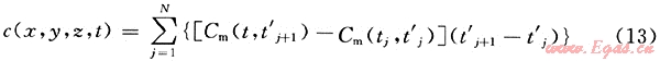 令t1=0,tN=t’,當時間較短時,取N=1000足可以滿足工程計算精度需求。則對任意時刻任意點處的濃度計算式為: