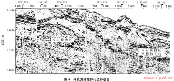 底辟構(gòu)造和天然氣水合物的形成與運移聚集也有密切的關(guān)系,底辟構(gòu)造由地球深部物質(zhì)上拱或刺穿到淺部產(chǎn)生,在形成過程中會引起構(gòu)造側(cè)翼和頂部沉積層的傾斜和破裂,促使流體的排放,因而對水合物的形成十分有利。大量的調(diào)查資料顯示[14~15]:珠江口盆地白云凹陷中心有大量底辟群的存在,在神狐海域前期調(diào)查中,識別出了5個泥底辟異常反射體,其中4個位于白云凹陷內(nèi)。這些識別出來的底辟構(gòu)造在高分辨率地震剖面上表現(xiàn)特征主要為地震反射模糊區(qū)(帶),橫向上反射同相軸的連續(xù)性變差或錯斷,內(nèi)部反射較雜亂,甚至為空白反射,局部見同相軸下拉現(xiàn)象;其兩側(cè)、頂部常見亮點振幅異常,白云凹陷北坡鉆井已揭示這種亮點與氣層存在良好對應(yīng)關(guān)系。因此,推斷這種反射模糊區(qū)應(yīng)為流體作用的結(jié)果(圖4)[16]。底辟構(gòu)造的存在說明凹陷中心曾經(jīng)孕育著高壓、超壓系統(tǒng)。由于現(xiàn)今地層具有正常壓力,這說明超壓的累積和釋放與深部烴源巖生烴及排烴有一定的關(guān)系。與底辟構(gòu)造密切伴生的大量亮點指示著沿底辟構(gòu)造的天然氣垂向輸導(dǎo),構(gòu)成了古近系油氣運移到新近系 第四紀(jì)的成藏動力系統(tǒng)。底辟構(gòu)造的發(fā)育在不同深度形成了上覆拱張,上覆地層產(chǎn)生了高角度的斷裂和垂向裂隙系統(tǒng),構(gòu)成流體運移的另一個通道。