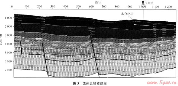 由于受區(qū)域構(gòu)造運動,特別是新構(gòu)造運動的作用,神狐研究區(qū)內(nèi)斷裂構(gòu)造發(fā)育。斷層可分為北東、北西和北北西向3組,且均為正斷層,其中北東向斷層有明顯切割北西向斷層的趨勢。斷層活動時間大致可分為晚中新世和上新世以來2個主要時期,晚中新世斷層以北西向為主,主要分布于研究區(qū)中北部,斷層大部分切割上中新統(tǒng),部分切穿上新統(tǒng),是研究區(qū)最主要斷層活動時期;上新世以來活動斷層以北東向為主,斷層活動強度小,但數(shù)量眾多。由于這些斷層貫通了下部氣源巖系與上部水合物形成的溫壓穩(wěn)定帶層系,改善了天然氣的垂向運移條件,而斷層活動時間又橫跨生氣和排氣高峰期,成為構(gòu)成流體運移的一個主要通道。同時,應(yīng)該注意到如果斷層過大,直通海底,會造成部分氣體的散失。從過SH2站位地震剖面流體運移模擬結(jié)果來看(圖3),由于該處發(fā)育斷裂,直通海底,導(dǎo)致深部熱解氣源部分通過斷裂直通海底散失,未能有效運移至水合物穩(wěn)定域,所以鉆井處熱解氣源對水合物貢獻較小。同時從圖中烴氣運移方向分析,該處鉆遇的水合物主要為淺層生物成因氣通過橫向運移至水合物穩(wěn)定域形成。