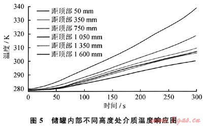 圖5所示為儲(chǔ)罐內(nèi)不同高度處介質(zhì)的溫度響應(yīng)規(guī)律??梢钥闯?,池火作用下儲(chǔ)罐內(nèi)部存在熱分層現(xiàn)象,溫度總體呈現(xiàn)上高下低的趨勢。本文所模擬的LPG儲(chǔ)罐的初始充裝率為72%,對(duì)應(yīng)的氣液分界面位于距儲(chǔ)罐頂部540mm處??梢?,氣相溫度明顯高于液相,且距離液面越遠(yuǎn)氣相溫度越高,說明氣相除了通過相變吸熱外,還通過氣相壁面吸收輻射熱量;另外,在距離儲(chǔ)罐頂部1350mm以下的液相區(qū),介質(zhì)溫度降低明顯,說明過冷液體區(qū)與液相分層區(qū)[2]的分界面可能位于此處附近。