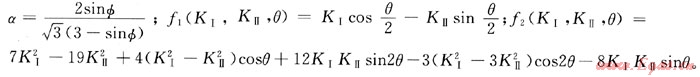國內(nèi)外學者對裂紋的失穩(wěn)擴展研究取得了豐碩的成果,建立了相應(yīng)的斷裂準則[6~7]通過適用性分析,筆者選用了基于巖石破壞準則的巖石斷裂判據(jù)[6]。筆者利用D-P破壞準則,并結(jié)合裂紋尖端的應(yīng)力場、應(yīng)力強度因子和斷裂韌度提出了該判據(jù),具體推導過程見本文參考文獻[6]。