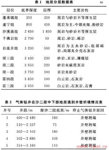 九龍山構(gòu)造區(qū)域?qū)儆诖ū臂晗輲е袎?、九龍山北東向構(gòu)造群,米倉山山前帶南部。西北緊鄰龍門山推覆構(gòu)造帶,北部為米倉山臺緣隆起,東南與川中隆起帶相鄰。地層分層數(shù)據(jù)見表1。地層分層的數(shù)據(jù)表明,在于佛巖組與自流井組存在堅硬的礫巖層,其礫巖成分有石英、燧石和黃鐵礦等,研磨性強,可鉆性極差,將導致機械鉆速急劇降低,以龍17井為例,在千佛巖組2932~3036m井段,進尺共104m,消耗鉆頭11只,平均單只鉆頭進尺僅為9.5m,平均機械鉆速為0.85m/h。多個區(qū)塊的鉆井實踐表明[3~6],與其他鉆井技術相比,氣體鉆井的提速效果異常明顯。因此,九龍山構(gòu)造開發(fā)前期,在沙溪廟組廣泛開展氣體鉆井技術,但是氣體鉆井雖然機械鉆速加快,但多口井卻出現(xiàn)井壁坍塌,使井況更加復雜(表2),且由氣體鉆井轉(zhuǎn)換為常規(guī)鉆井后,下部地層的機械鉆速降低明顯。若要在下部地層繼續(xù)安全快速鉆進,液體欠平衡鉆井可作為一種重要手段。