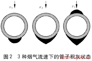煙氣中攜帶的飛灰及催化劑粒徑一般都小于200μm,大部分是10~20μm的顆粒。當(dāng)含灰的氣流沖刷管束時(shí),產(chǎn)生旋渦區(qū),大顆粒由于慣性大,不易進(jìn)入旋渦,進(jìn)入旋渦區(qū)的大部分為微小顆粒。在分子力吸附作用和靜電力的作用下,遇到低溫受熱面管壁便聚積下來(lái)。松灰呈干松狀,易吹除,但其熱阻很大,對(duì)傳熱有很大影響[3]。積灰主要在管子背風(fēng)面形成,當(dāng)煙氣流速較大時(shí),迎風(fēng)面基本沒(méi)有積灰,因此積灰程度與煙氣流速有關(guān)。3種煙氣流速下管子的積灰狀態(tài)見(jiàn)圖2。圖中,v1>v2>v3。對(duì)于最高的煙氣流速v1,管子積灰最少,v2積灰較多,v3積灰最嚴(yán)重。因此,煙氣流速越大,在管子的背風(fēng)面越不易積灰。