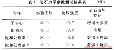 評價井壁穩(wěn)定處理劑綜合性能的重要方法之一就是測量對比飽和處理劑與飽和水的巖石力學參數(shù)變化。室內采用聚合物處理劑浸泡過的泥巖巖樣進行巖石力學參數(shù)測試。實驗結果見表3。