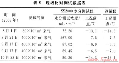 從實驗數(shù)據(jù)可以看出,儀器重復(fù)性滿足說明書技術(shù)指標(biāo)要求,相對標(biāo)準(zhǔn)偏差較小,儀器的測量精度未受到天然氣中各種雜質(zhì)的影響,運行可靠,能滿足現(xiàn)場在線測試的要求。在B站現(xiàn)場儀器與冷鏡法的比對數(shù)據(jù)見表5。
