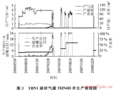 THN1凝析氣藏的生產(chǎn)動(dòng)態(tài)資料顯示,2007年7月開(kāi)始排液采氣時(shí),排液井僅2口——THN2、THN4H井,且排液僅15d(7月12~27日)后即關(guān)井,至8月12日又才開(kāi)井排液。排液井?dāng)?shù)少、排液時(shí)間短,在短時(shí)間內(nèi)不能完全阻止已推進(jìn)氣藏內(nèi)部的邊水繼續(xù)向前推進(jìn),導(dǎo)致內(nèi)部氣井,甚至一線井都不見(jiàn)效。