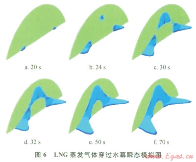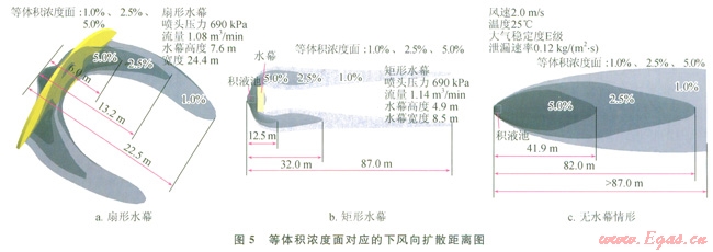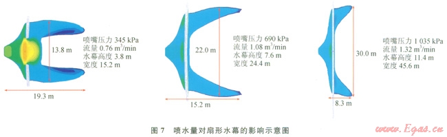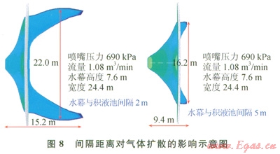 下面對扇形水幕的參數(shù)進行研究,包括噴水量和水幕和擴散源之間的間隔,這二者是影響水幕阻擋效果的主要因素。圖7顯示了不同水流量下,水幕對氣體擴散的影響,在相同的大氣條件下,水流量越大,形成的水幕尺寸也就越大。當(dāng)扇形水幕流量為l.32m3/min,壓力1035kPa時,水幕高度為11.4m,寬度45.6m,LNG蒸發(fā)氣體下風(fēng)向擴散的安全距離為8.3m。