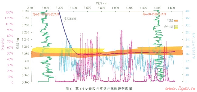 蘇里格氣田儲層含氣砂體薄,傾角變化大,LWD測點監(jiān)測儲層信息滯后于鉆頭位置,實鉆過程中井眼軌跡調(diào)整頻繁,砂體有效鉆遇率低。為提高氣層有效鉆遇率,提高鉆井速度,針對軌跡控制難題,通過鉆具力學(xué)分析與儲集砂體走向評價,改變了以往的鉆具組合,實施近鉆頭測量[14],形成了“精確監(jiān)控、緩慢糾偏、斜有余地、穩(wěn)斜探頂”的軌跡控制技術(shù)。該項技術(shù)能夠及時掌握實鉆軌跡,并根據(jù)地質(zhì)提示提前做出調(diào)整,避免軌跡大幅度變化,降低了軌跡控制難度,提高了砂體有效鉆遇率,縮短了鉆井周期。2010年該技術(shù)在蘇61A-4HX井應(yīng)用,實現(xiàn)了砂層鉆遇率85.6%,氣層(含氣層)鉆遇率67.6%的突破(圖6)。2011年該技術(shù)在蘇里格氣田實現(xiàn)規(guī)模應(yīng)用,先后鉆井l63口,平均砂巖鉆遇率81.4%,氣層(含氣層)鉆遇率65.5%。