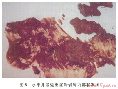該體系2011年開始在水平井規(guī)模推廣,現(xiàn)場應(yīng)用累計超過80井次,平均縮短水平井段施工周期5~8d,應(yīng)用效果表明,無土相暫堵鉆(完)井液體系潤滑防卡性能好、低剪切速率下攜屑能力強,返出H泥巖巖屑內(nèi)部呈干態(tài),表明抑制性良好,未出現(xiàn)吸水膨脹現(xiàn)象(圖8)。