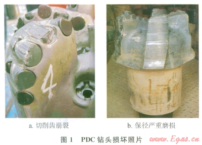 蘇里格氣田屬于非均質(zhì)性極強的致密巖性氣田,儲層深度達3500m,鉆遇地層中的白堊系、侏羅系、三疊系、二疊系等地層硬度高、可鉆性差,其中紙坊組一石千峰組為含礫石夾層砂巖,鉆時極慢,直井段平均機械鉆速5.37m/h,斜井段復(fù)合鉆進平均機械鉆速1.01m/h,滑動鉆進平均機械鉆速0.35m/h。鉆進時蹩跳嚴重,往往造成PDC鉆頭切削齒崩裂、肩部齒脫落、保徑嚴重磨損等早期損壞(圖1)。