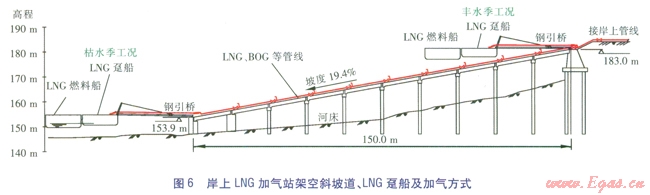 儲(chǔ)氣罐布置于岸上,安全可靠性強(qiáng);有現(xiàn)行國(guó)家規(guī)范作為設(shè)計(jì)、施工依據(jù);岸上LNG卸氣與船上LNG加氣可同時(shí)進(jìn)行,LNG加氣時(shí)間不受影響,充分滿足加氣船舶的需求;岸上LNG儲(chǔ)存設(shè)施可預(yù)留位置,加氣規(guī)模有發(fā)展余地;架空斜坡道長(zhǎng)度短,施工工期略短,對(duì)通航行洪影響??;造價(jià)較低。