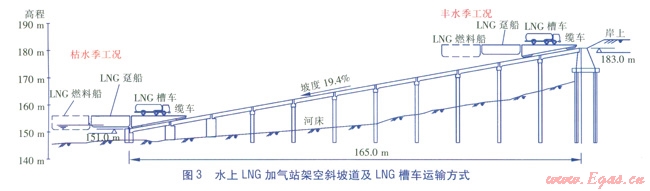 水上LNG加氣站架空斜坡道及LNG槽車運(yùn)輸方式見(jiàn)圖3。