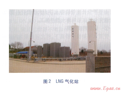 在長輸管道通氣之前,LNG氣化站一直是海陽旅游度假區(qū)的主要氣源。該氣化站是我公司于2005年作為海陽市招商引資項目投資建設的(見圖2)。主要設備有兩臺l00m3立式LNG儲罐,一臺2000m3/h空溫式氣化器,一臺2000m3/h水浴式氣化器,一臺200m3/h卸車增壓器,一臺400m3/h的BOG增壓器。日供氣量約10×104m3/d。將LNG氣化站作為氣源三,其出口壓力為0.27MPa,出口管道規(guī)格為SDRll PE80 NOD 250mm,距離火炬調壓計量柜約7km,與主氣源一、二配合完全可以滿足火炬高峰用氣量。