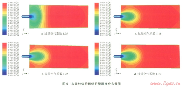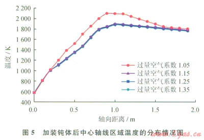 增加鈍體可以有效增加燃燒器出口的回流區(qū)域,使燃燒產(chǎn)生的高溫炯氣回流,增加燃燒的穩(wěn)定性,提高燃燒效率,同時還能有效提高爐膛溫度的均勻性。圖5為在燃燒器出口加裝鈍體后的中心軸線區(qū)域溫度分布情況,圖6為燃燒爐膛溫度分布云圖。