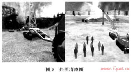 通過仿真平臺模擬井噴失控后帶火作業(yè)的帶火清障及井口清障過程[5~7],模擬搶險隊員進行切割、拖拉作業(yè),直到徹底清除井架底座,采用引火筒將散狀火焰集中引導垂直向上,完成滅火前井口周圍的徹底清障,使井口完全暴露,如圖5所示。