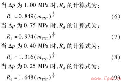 將表1中的沖擊波超壓代入式(5),可得到不同沖擊波超壓下的爆轟破壞半徑計(jì)算式。
