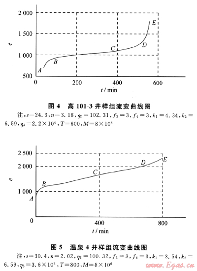 圖4中的AB段是油氣井在外界作用下的減速損傷階段,與承載的時間關(guān)系不大,為瞬間損傷。在第一保護區(qū)的作用下,損傷速度由大變小,損傷加速度小于0。BC段是油氣井等速損傷階段,此階段流變曲線形似一條直線,損傷速度接近常數(shù),損傷加速度為0。CD段是油氣井加速損傷階段,此階段損傷速度不斷增大,加速度也大于0。AD段是安全流變階段,其中D點是突變警戒點,從此點開始油氣井的運動開始發(fā)生了質(zhì)變,進入了危險狀態(tài)。DE屬于安全突變階段。