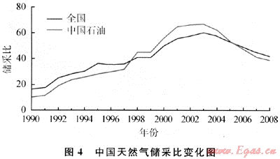 中國的天然氣儲采比在1990年僅為16,后來持續(xù)增長,1998年儲采比首次突破40(為42),2003年達到最高值(為61,見圖4),隨后因年產量增加而略有下降,2008年為42。中國石油的儲采比從1990年的10增至2003年的67,達到高峰,隨后下降至2008年的39。2008年中國石化的儲采比為75,中國海油為33。從目前的儲采比來看,中國天然氣產量快速增長具有較好的儲量基礎。