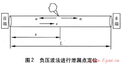 在管道首末兩端安裝壓力傳感器,并由SCADA系統(tǒng)記錄傳感器傳送的數(shù)值。當泄漏發(fā)生時,會在管道內(nèi)產(chǎn)生負壓波動,從泄漏點向上、下游傳播,并以指數(shù)規(guī)律衰減,這種壓力波動和正常壓力波動大不相同,具有幾乎垂直的前緣。首末兩端的壓力傳感器分別在不同時刻捕捉到負壓波信號,從而判斷管道發(fā)生了泄漏,根據(jù)負壓波傳到管道兩端的時間差和負壓波波速可以進行泄漏點定位[8]。