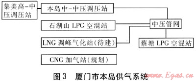 廈門市本島供氣系統(tǒng)見圖3。鑒于本島地理位置(四面環(huán)海,外圍既無高壓管道,也無地下儲(chǔ)氣庫)的特點(diǎn),LNG氣化站是城市管網(wǎng)供氣高峰調(diào)峰和事故應(yīng)急的首選方式。
