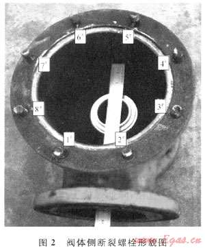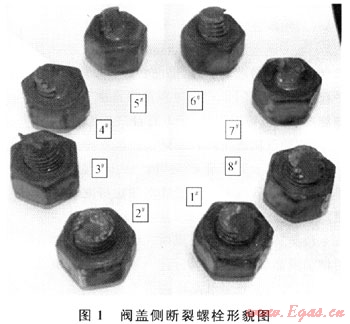 閥蓋上的8個(gè)螺栓光孔均發(fā)生了月牙形磨損或擠壓變形成為橢圓形,其中橢圓長軸沿徑中心。對(duì)光孔長軸和短軸進(jìn)行測量并計(jì)算橢圓度,發(fā)現(xiàn)1#、2#、3#、8#光孔比4#、5#、6#、7#光孔橢圓度大(光孔編號(hào)與螺栓編號(hào)一一對(duì)應(yīng))。
