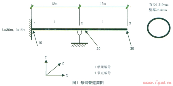 大口徑、厚壁管道,是指鋼管外徑和壁厚之比小于20的鋼管,廣泛應(yīng)用于自來水、天然氣、石油、化工、醫(yī)藥、通訊、電力、海洋工程等領(lǐng)域。其應(yīng)力分析主要是為了滿足管道設(shè)計(jì)強(qiáng)度和柔性要求,確保管道在各種工況下安全運(yùn)行,而載荷是導(dǎo)致管道內(nèi)產(chǎn)生應(yīng)力的基本原因。大口徑、厚壁管所受的載荷按照載荷性質(zhì)可分為靜載荷、動(dòng)載荷和溫度載荷。為了便于分析,本文只研究管道所受的靜載荷,即對(duì)大口徑、厚壁管進(jìn)行靜力分析。該類管道的靜力分析主要有3類:一是壓力載荷和持續(xù)載荷作用下的管道一次應(yīng)力計(jì)算,為防止塑性變形破壞;二是管道熱脹冷縮以及端點(diǎn)附加位移載荷作用的管道二次應(yīng)力計(jì)算,為防止疲勞破壞;三是管系位移計(jì)算,為防止管道碰撞和支吊點(diǎn)位移過大。由于管路沿線的地貌復(fù)雜,引起管道應(yīng)力的因素較多,針對(duì)大口徑、厚壁管的應(yīng)力分析,我們主要考慮管系自重、內(nèi)壓和溫度3大要素。下面將以大口徑、厚壁管中的懸臂管道為例,對(duì)CAESARⅡ軟件應(yīng)用于這類管道的應(yīng)力分析作可行性研究。
