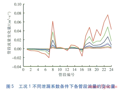 對上述數(shù)據(jù)進(jìn)行處理,求得工況l不同泄漏系數(shù)條件下各管段流量相對于正常工況流量的變化量,即正常工況時管段的流量減去泄漏工況時管段的流量,見圖5。