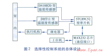 選擇性控制系統(tǒng)的設(shè)計(jì)思路是在優(yōu)先保證室內(nèi)溫度達(dá)到預(yù)設(shè)值的前提下,調(diào)節(jié)室內(nèi)空氣相對(duì)濕度以最大限度地降低空調(diào)系統(tǒng)能耗。溫濕度傳感器實(shí)時(shí)測(cè)量室內(nèi)空氣的溫濕度,并通過串行接口將溫濕度信號(hào)傳至單片機(jī),單片機(jī)將接收到的溫濕度信號(hào)與內(nèi)部預(yù)置及計(jì)算的溫濕度范圍進(jìn)行比較判定,并將實(shí)時(shí)溫濕度信號(hào)通過通信接口上傳至上位機(jī)顯示。在單片機(jī)比較判定結(jié)束后,將控制信號(hào)傳遞給繼電器,繼電器通過控制執(zhí)行機(jī)構(gòu)在優(yōu)先滿足室內(nèi)溫度需要的前提下,進(jìn)行室內(nèi)空氣相對(duì)濕度調(diào)節(jié)[4]。選擇性控制系統(tǒng)的總體設(shè)計(jì)見圖2。
