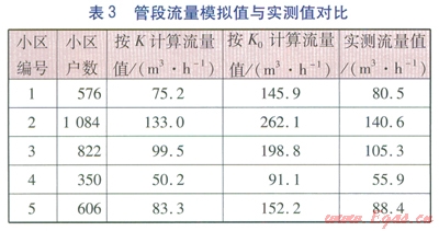 為了驗證計算得到的同時工作系數(shù)的準確性,下面分別利用同時工作系數(shù)K與K計算該地區(qū)5個小區(qū)的管段流量,并將結(jié)果與實測流量值進行對比,見表3。