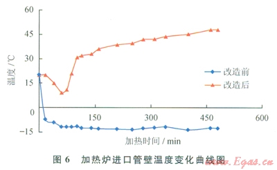 分析上述圖表數(shù)據(jù)可以得出:①改造后加熱時(shí)間減少了27.3%,再生氣用量減少了18.4%,加熱爐電耗量減少了28.6%;②由于再生氣余熱是一個(gè)自身循環(huán)預(yù)熱的過程,大約lh之后,換熱爐才開始對(duì)再生氣預(yù)熱,隨后加熱爐進(jìn)口溫度緩慢升高,最后管壁溫度穩(wěn)定在47℃左右;③再生氣余熱利用存在滯后,隨著換熱器逐漸換熱,加熱爐單位時(shí)間電耗量相比改造前電耗減小,充分說明再生氣余熱得到利用,達(dá)到了節(jié)能運(yùn)行的目的。