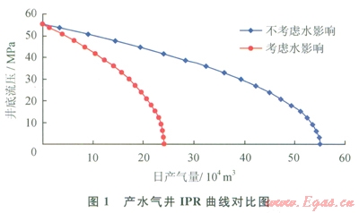 某水驅(qū)氣藏中1口氣井的實(shí)際生產(chǎn)資料、測(cè)壓資料、初期不產(chǎn)水時(shí)不穩(wěn)定試井解釋成果、井身資料和實(shí)驗(yàn)室數(shù)據(jù)如下:井半徑0.1m,油管直徑88.9mm,產(chǎn)層厚度35.5m,地層中部溫度405.49K,氣體相對(duì)密度0.574,供給邊界半徑720m,表皮系數(shù)1.98,氣井深度4887.7m,滲透率l.356mD,目前地層壓力55.12MPa,產(chǎn)氣量5.6×104m3/d,產(chǎn)水量l8.9m3/d,井口油壓31.9MPa,平均偏差因子1.24,氣體平均黏度0.0365mPa·S。根據(jù)上述理論計(jì)算可得,目前生產(chǎn)條件下的井底流壓為48.4MPa,氣相滲透率為0.59mD。考慮水影響時(shí),二項(xiàng)式產(chǎn)能方程系數(shù)A1為0.012365、Bl為1.10×10-9、無(wú)阻流量為24.06×104m3/d;不考慮水影響時(shí),二項(xiàng)式產(chǎn)能方程系數(shù)A為0.005353、B為3.14×10-10、無(wú)阻流量為54.99×104m3/d。計(jì)算結(jié)果表明,地層中的氣水兩相流動(dòng)使得氣井的無(wú)阻流量下降了56.25%。考慮及不考慮水影響的氣井流入動(dòng)態(tài)關(guān)系曲線如圖1所示。