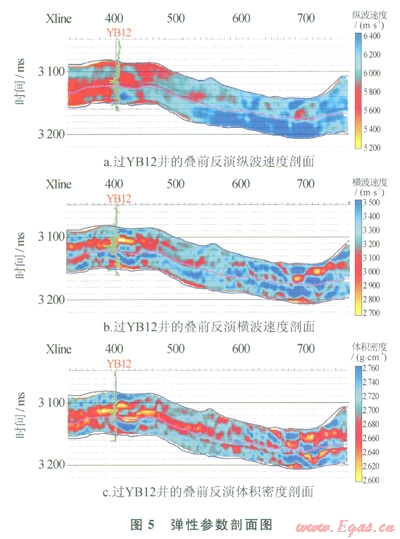 目前,各種地震疊前數(shù)據(jù)反演的軟件[16]。和疊前反演的方法[17-22]都比較成熟,通過(guò)較好的疊前三維地震資料可以較準(zhǔn)確地反演出縱波速度、橫波速度和體積密度等彈性參數(shù)。圖4為過(guò)YBl2井的原始疊后地震剖面。儲(chǔ)層位于圖中標(biāo)注的層位為下三疊統(tǒng)飛仙關(guān)組一段上二疊統(tǒng)長(zhǎng)興組之間[23-25]。從剖面上可以看出地層的橫向變化大,分辨率低,信噪比較低等特征。圖5-a、b和c分別為應(yīng)用疊前同時(shí)反演方法獲得的縱波速度、橫波速度和體積密度反演剖面。從圖中可以看出,井旁道反演的數(shù)據(jù)與測(cè)井曲線的相關(guān)性較好。從反演數(shù)據(jù)剖面中可以發(fā)現(xiàn),疊前彈性參數(shù)反演獲得橫波速度數(shù)據(jù)和密度數(shù)據(jù)剖面的分辨率高于縱波速度數(shù)據(jù)剖面上的分辨率,為縱向高分辨率的孔隙度計(jì)算提供了條件。圖6為應(yīng)用本方法計(jì)算的過(guò)YB12井的孔隙度剖面。從圖6中還可以看出,計(jì)算孔隙度與實(shí)測(cè)孔隙度之間的相關(guān)性非常高,計(jì)算的孔隙度數(shù)據(jù)的分布范圍也與測(cè)井?dāng)?shù)據(jù)相當(dāng)吻合,并且從孔隙度剖面上能夠?qū)⒃搩?chǔ)層段分為上下兩套孔隙度發(fā)育的儲(chǔ)層,孔隙度計(jì)算剖面上展布的橫向規(guī)律與地質(zhì)、鉆井認(rèn)識(shí)規(guī)律保持一致。因此,從孔隙度計(jì)算的結(jié)果可以看出,筆者提議的孔隙度計(jì)算方法在碳酸鹽巖儲(chǔ)層孔隙度計(jì)算中效果比較明顯,能夠較好地提高孔隙度計(jì)算的精確度。