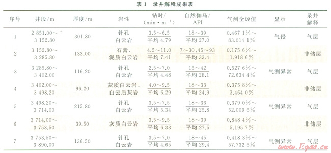 綜合前面的分析以及該井的實(shí)鉆情況,以巖屑、鉆時(shí)、氣測、伽馬作為錄井隨鉆評價(jià)的主要參數(shù),即通過對碳酸鹽巖分析結(jié)果、巖屑顯微觀察以及隨鉆伽馬曲線的綜合分析,準(zhǔn)確識別出正鉆地層巖性。再利用建立的儲(chǔ)層鉆時(shí)、氣測判別標(biāo)準(zhǔn),對儲(chǔ)層進(jìn)行識別和劃分(圖5、表l),結(jié)果如下。