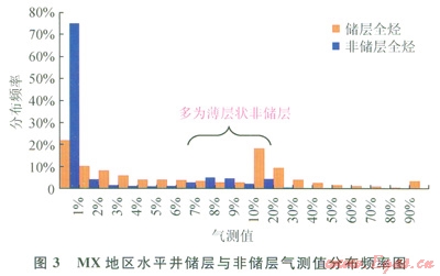 氣測值的影響因素頗多,用以判別儲(chǔ)層存在很大難度。但通過統(tǒng)計(jì)分析發(fā)現(xiàn),在MX地區(qū)的水平井,由于儲(chǔ)層段的平均孔隙度較高,其含氣量與非儲(chǔ)層存在明顯差異,加之MX地區(qū)屬于勘探成熟區(qū)塊且構(gòu)造平緩,使用的鉆井液性能基本一致,氣測值能有效地反映水平井儲(chǔ)層的發(fā)育狀況。