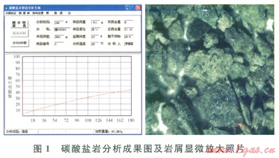 準(zhǔn)確鑒別巖屑,正確識別出地層巖性是儲(chǔ)層評價(jià)的首要條件,并可根據(jù)鑒別結(jié)果直接篩除掉非儲(chǔ)層巖性段(頂部石膏和底部石灰?guī)r)。為了準(zhǔn)確識別巖屑巖性,在利用遲到時(shí)間實(shí)測法對巖屑進(jìn)行了準(zhǔn)確歸位后,采用碳酸鹽巖分析儀對巖屑進(jìn)行逐米鑒別,并結(jié)合巖屑顯微放大掃描對巖屑巖性、顆粒及儲(chǔ)集空間特征進(jìn)行分析(圖1)。實(shí)鉆過程中,通過多種巖屑識別方法的綜合運(yùn)用,該井巖屑識別較為準(zhǔn)確并與隨鉆伽馬具有較好的對應(yīng)性。
