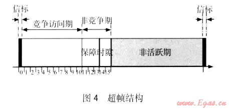在IEEE802.15.4 MAC協(xié)議定義了超幀結(jié)構(gòu),如圖4所示。在幀群中存在兩個(gè)部分:活躍期與不活躍期(休眠期),在活躍期開放信道接入,休眠期關(guān)閉信道,進(jìn)入休眠狀態(tài)以減少能耗。