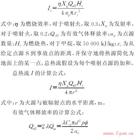 2,用時(shí)分別為27s和1162.3s,低于該熱流值時(shí)人員不會死亡、木質(zhì)結(jié)構(gòu)不會損壞。為此,危險(xiǎn)輻射強(qiáng)度取15.77kW/m2,兩種工況下噴射火的危險(xiǎn)半徑分別為45m和50m。