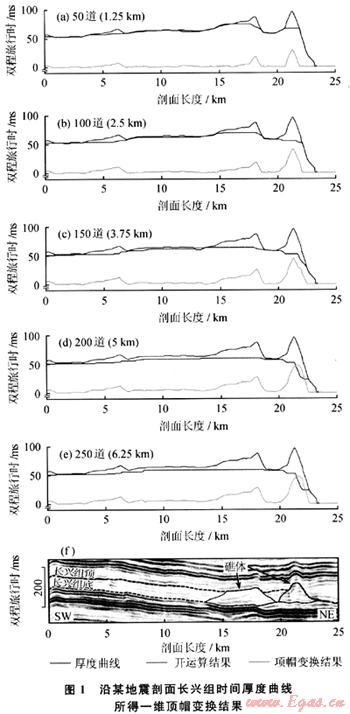 從幾何特征出發(fā),可以利用含礁體地層的厚度參數來刻畫礁體的分布。這需要在地震數據體上準確地拾取含礁體地層的頂、底界面,然后計算出其間的厚度,據此推斷礁體的分布,其中厚度較大的區(qū)域是礁體的潛在分布區(qū)域。該方法原理簡單、易于操作,是定性判斷礁體分布的有效方法;其不足之處足只能大致圈定可能的礁體發(fā)育區(qū)域,不能定量地分離出各個孤立礁體的位置及分布范圍。筆者根據生物礁沉積厚度較同期非礁相地層大這一簡單的沉積地質學原理。引入數學形態(tài)學中的頂帽變換方法,實現礁體分布的自動探測。
