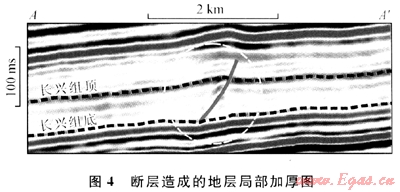 值得注意的是,在頂帽變換結果圖(圖3-a)上,其西南角有一長條狀高值異常區(qū)域,經與地震剖面對比后確認其為一小型逆斷層引起的地層局部加厚,并非礁體引起的厚度異常(圖4)。因此,頂帽變換預測的厚度高值異常區(qū),除了生物礁外,還可能為斷層等其他因素引起。