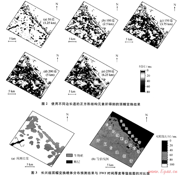 最終選取邊長為150道的結構元素進行頂帽變換,其結果如圖3-a所示。由該圖可知,研究區(qū)內長興組總共發(fā)育有110多個礁體,礁體尺寸大小不等,小的數百米,大的逾5km;礁體主要分布于研究區(qū)中部,呈北西 南東向展布。這一結果與時間厚度圖(圖3-b)所揭示的規(guī)律相同,但直接根據厚度圖很難明確地區(qū)分出各個礁體的具體位置和分布范圍。