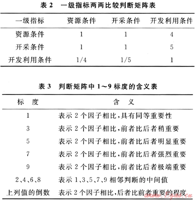 煤層氣勘查潛力指標(biāo)體系分為4層,其中目標(biāo)層為綜合評(píng)價(jià)值,準(zhǔn)則層有3層(分為三級(jí)指標(biāo))。下面以一級(jí)指標(biāo)權(quán)重計(jì)算為例,描述層次分析法確定權(quán)重的過程。專家討論后的打分結(jié)果見表2。專家打分時(shí)一般采用數(shù)字1~9及其倒數(shù)作為重要性標(biāo)度,其含義見表3,計(jì)算方法參見本文參考文獻(xiàn)[15]。