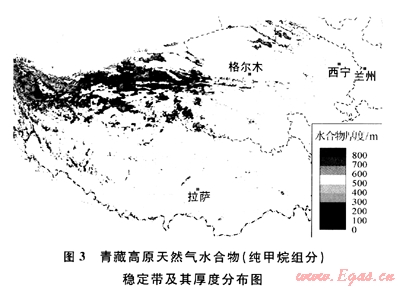 進(jìn)一步地,筆者分別利用祁連山木里地區(qū)33號鉆孔冷泉?dú)?CH4:96.6%,C2H6:3.3%,C3H8:0.1%,均為摩爾分?jǐn)?shù),下同)、風(fēng)火山-鳥麗地區(qū)頂空氣平均值(CH4:93.8%,C2H6:6.2%)和羌塘盆地雙湖地區(qū)頂空氣平均值(CH4:63.3%,C2H6:24.3%,C3H8:8.9%,nC4H103.5%)等實(shí)測氣體組分,結(jié)合青藏高原的其他參數(shù),對青藏高原天然氣水合物的穩(wěn)定帶及其厚度進(jìn)行了計(jì)算,結(jié)果顯示青藏高原具備較好的天然氣水合物形成條件,即使要求最為苛刻的純甲烷水合物也能在局部地區(qū)形成(圖3),且隨著重?zé)N組分的逐漸增加,能形成水合物的地區(qū)范圍逐漸增大,水合物穩(wěn)定帶厚度也逐漸增厚。