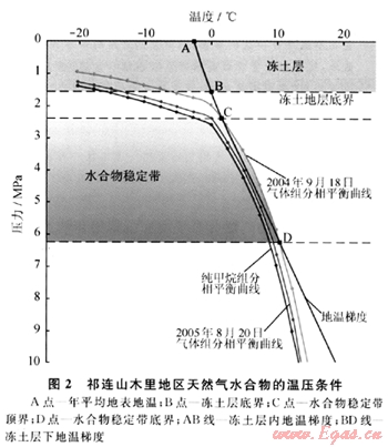 天然氣水合物形成于低溫高壓環(huán)境下,并需要有接近于飽和的氣源條件和充足的水源條件,同時(shí)氣體組成及其孔隙水鹽度也將影響到水合物能否形成并保持穩(wěn)定。由于中國凍土區(qū)的水源條件比較豐富,故制約水合物能否形成的關(guān)鍵因素是氣源條件和溫壓條件,這里先就溫壓條件進(jìn)行深入分析。