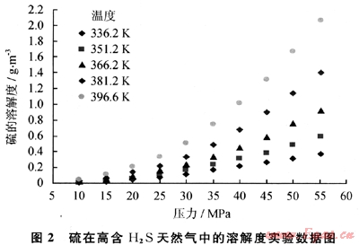 1) 測(cè)定了溫度336.2~396.6K、壓力10.0~55.2MPa范圍內(nèi)硫在高含H2S天然氣中的溶解度為0.0083~2.O672g/m3。