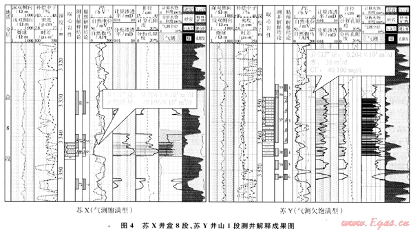 蘇X井盒8段(圖4),峰形飽滿,全烴顯示厚度比儲(chǔ)層厚度大,氣測(cè)解釋為氣層,電測(cè)解釋氣層,綜合分析解釋為氣層,試氣獲無(wú)阻流量9.7914×104m3/d的工業(yè)氣流。蘇Y井山1段(圖4),全烴峰值顯示較低,峰形不飽滿,全烴顯示厚度小于儲(chǔ)層厚度,氣測(cè)解釋為氣水同層,電測(cè)解釋為差氣層,綜合分析為氣水同層。經(jīng)測(cè)試井口產(chǎn)量0.035 4×104m3/d,水36m3/d,驗(yàn)證了利用聲波時(shí)差 電阻率圖版法與氣測(cè)綜合分析判斷識(shí)別氣水層的準(zhǔn)確性。