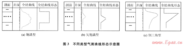 全烴曲線是整個(gè)測(cè)量手段中唯一一條實(shí)時(shí)檢測(cè)地層烴類氣體的連續(xù)曲線,它包含了大量地層信息,它的高低、曲線形態(tài),直接反映著油氣在縱向上的變化情況。因此根據(jù)全烴曲線形態(tài)可以對(duì)儲(chǔ)層流體性質(zhì)作出進(jìn)一步的判斷。