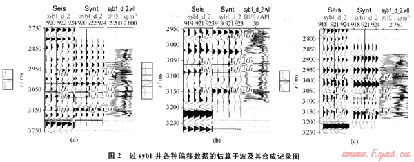 對(duì)于近道、中道和遠(yuǎn)道數(shù)據(jù)體分別提取了子波,經(jīng)過多次子波估算,最后得到了比較理想的子波以及由估算的子波制作的合成記錄。圖2-a是過syb1井的近道數(shù)據(jù)的估算子波及其合成記錄,圖2-b是過syb1井的中道數(shù)據(jù)的估算子波及其合成記錄,圖2-c是過 syb1井的遠(yuǎn)道數(shù)據(jù)的估算子波及其合成記錄。