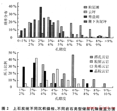 沉積微相是有利儲層發(fā)育的基礎(chǔ)。從沉積作用的角度來看,川東石炭系主要發(fā)育潮坪沉積體系,主要的沉積微相是粒屑灘、云坪、潮下灰泥坪、與膏鹽湖等沉積微相[14~15]。根據(jù)對這些沉積微相的儲層孔隙度等的統(tǒng)計,展示粒屑灘微相的白云巖儲層物性最好(圖2上),孔隙度區(qū)間多介于3%~9%,部分可超過9%,這是因為粒屑灘不僅存在一定的原始沉積孔隙,為埋藏期儲層的白云化、溶蝕作用的發(fā)生創(chuàng)造了有利條件,而且使溶蝕孔隙成為主要的儲集空間。其次是云坪微相,其孔隙度區(qū)間為1%~7%,也有部分超過9%;而潮下灰泥坪與膏鹽湖微相的儲層孔隙度多低于4%,只有少量為4%~9%。因此,粒屑灘沉積微相最有利儲層的形成,并對儲層的后期改善起到重要促進作用。