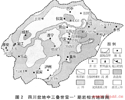 1) 中三疊世雷口坡期四川盆地為障壁蒸發(fā)漏湖沉積,由雷一-雷四期,膏鹽湖中心從川中南充地區(qū),逐漸擴(kuò)大至簡陽,最后遷移至鹽亭蒲西地區(qū),圍繞膏鹽湖分布白云巖坪及顆粒灘。